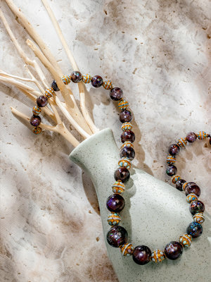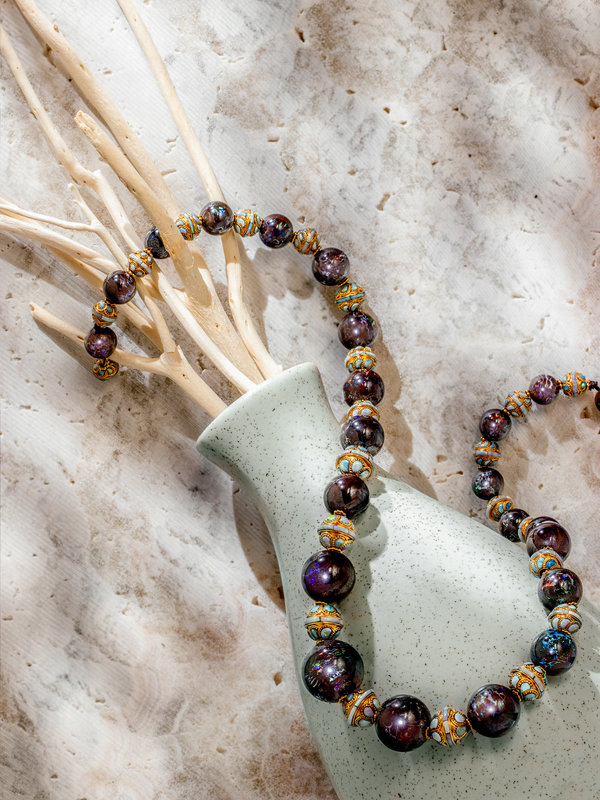 Consisting of yellow gold and opal inlay beads decorated in granulation detail, alternating with bolder opal measuring approximately 18.20-10.10 mm in diameter. 20 1/2 inches long.
