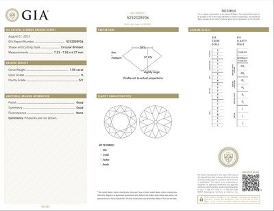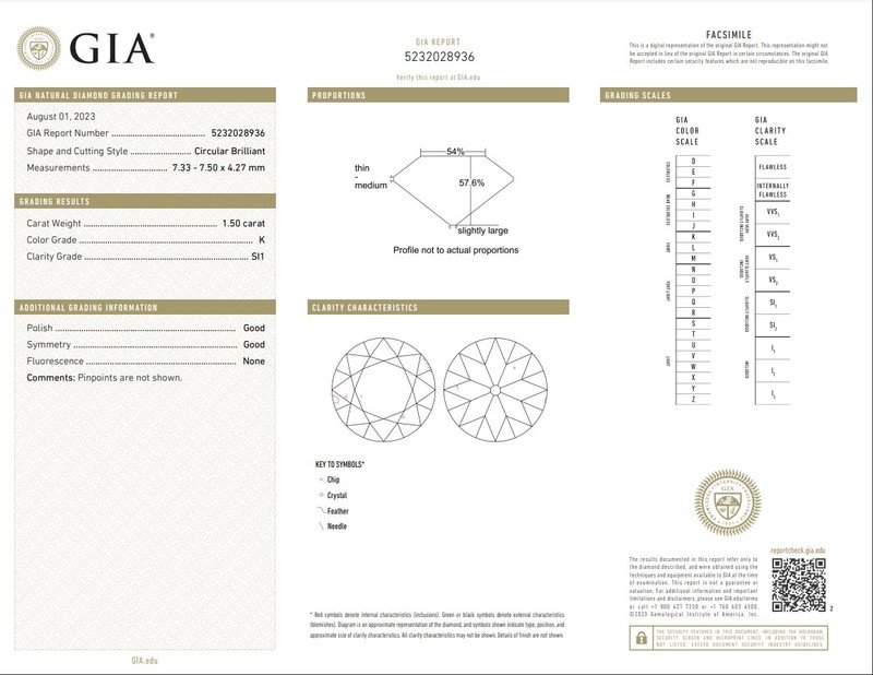 GIA, 2023, Report No. 5232028936, 1.50 carats, K color, SI1 clarity, No fluorescence