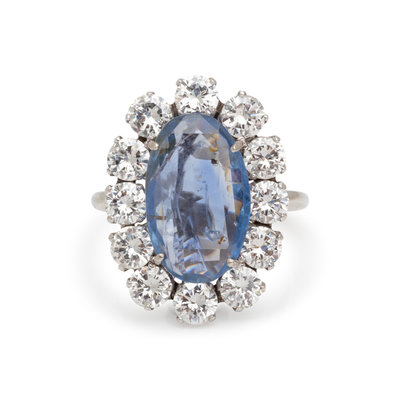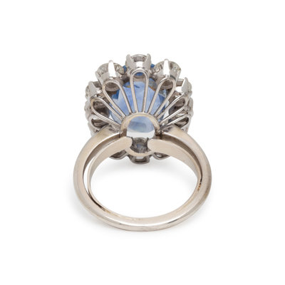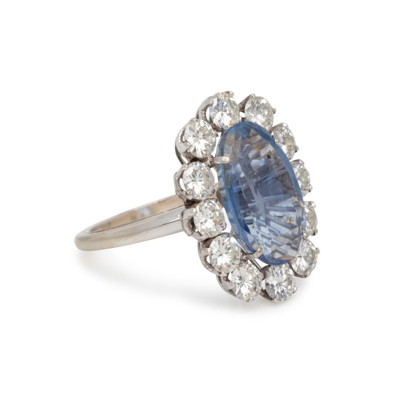 Containing one oval modified step cut sapphire measuring approximately 15.88 x 9.80 x 4.10 mm and 12 round brilliant cut diamonds weighing approximately 3.00 carats total. Mounted in white gold. Ring size 6 3/4.