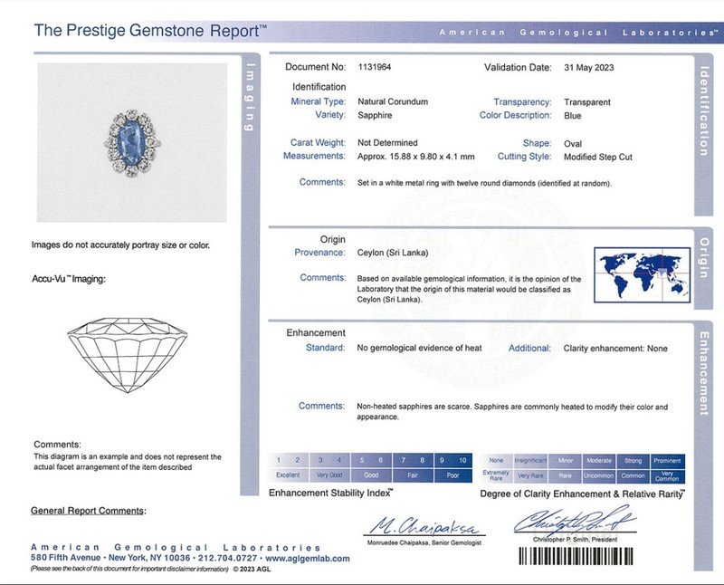 AGL, 2023, Report No. 1131964, Natural Corundum, Sapphire, Ceylon (Sri Lanka), No heat