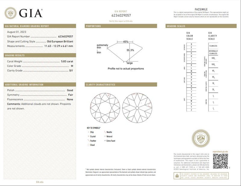 GIA, 2023, Report No. 6234029057, 5.83 carats, M color, SI1 clarity, No fluorescence