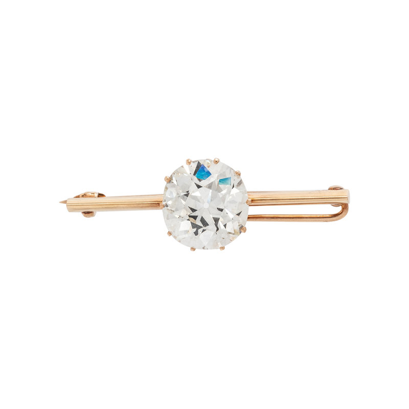 Containing one old European cut diamond weighing 5.83 carats. Mounted in yellow gold. 1 1/2 long.