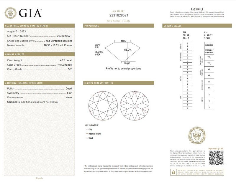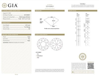 GIA, 2023, Report No. 2231028521, 4.25 carats, Y-Z color, SI2 clarity, No fluorescence
