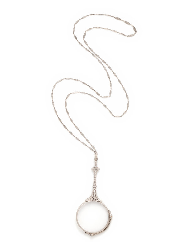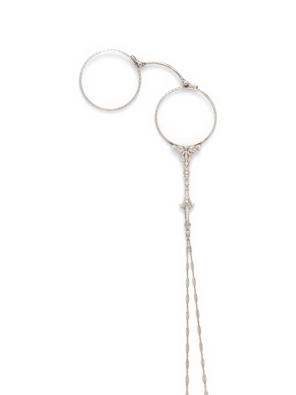 In a foliate motif, containing numerous single cut diamonds and push button release of spectacles, suspended from an attached fancy link chain. Lorgnette: 4 inches long. Chain: 28 inches long.