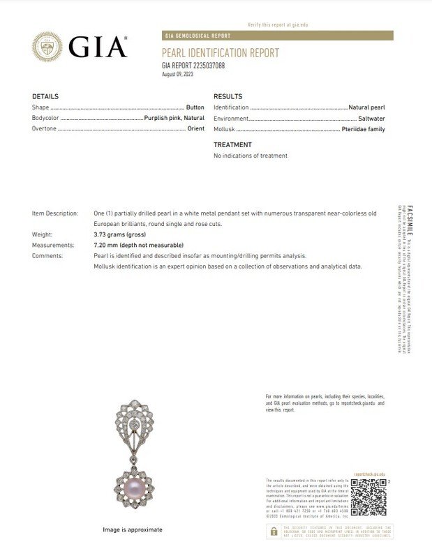 GIA, 2023, Report No. 2235037088, Natural pearl, Saltwater, Pteriidae family, Purplish pink body color, Orient overtone