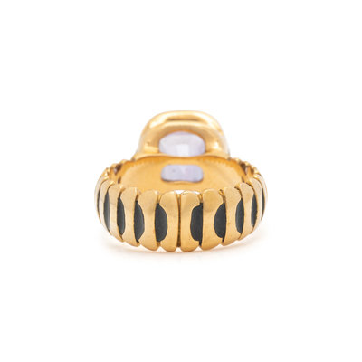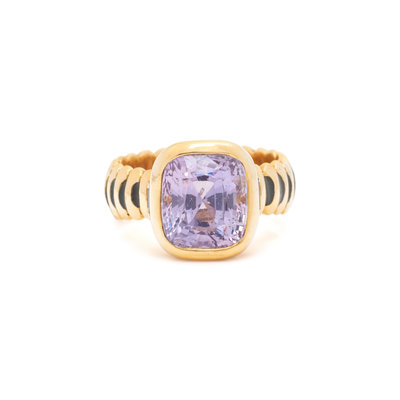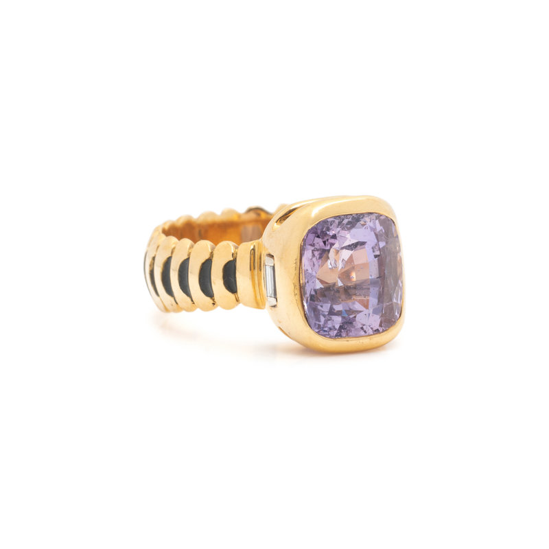 Containing one cushion shaped purple sapphire measuring approximately 10.20 x 9.35 x 7.55 mm, two baguette cut diamonds and grey enamel detail. Mounted in yellow gold. Ring size 6 1/2.