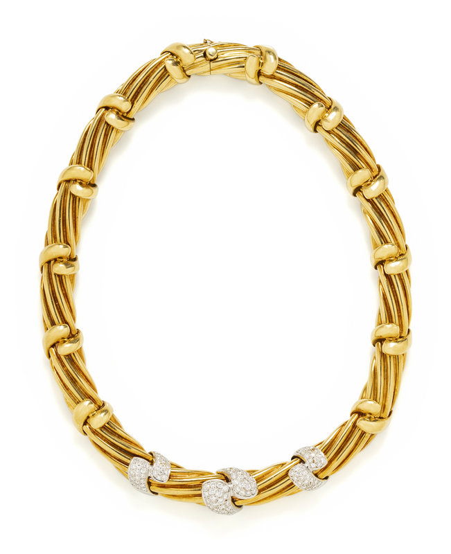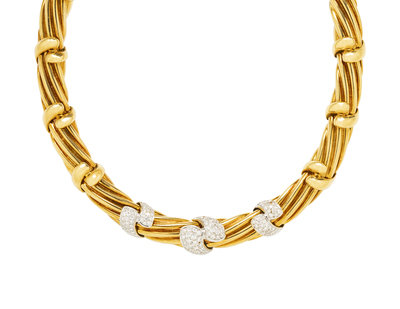 Consisting of wide cable links accented with gold ties, the front three set with numerous round brilliant cut diamonds weighing approximately 3.40 carats total. 15 3/4 inches long.
