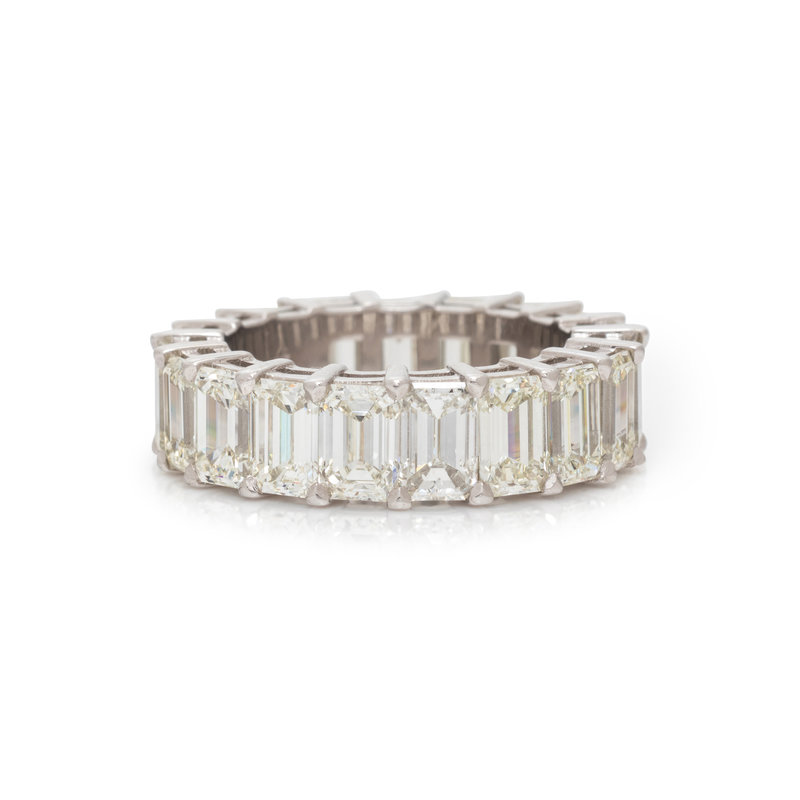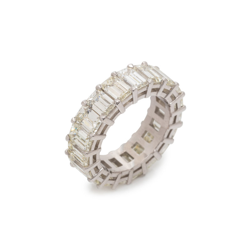 Containing 19 emerald cut diamonds weighing approximately 9.65 carats total. Mounted in platinum. Ring size 6 1/4.