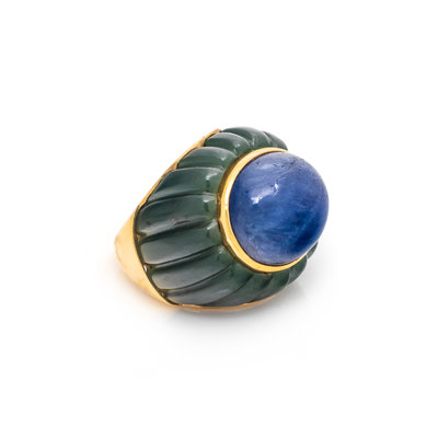 Containing one oval cabochon sapphire measuring approximately 17.45 x 14.70 mm in a melon carved nephrite jade surround. Mounted in yellow gold. Ring size 7 1/2.