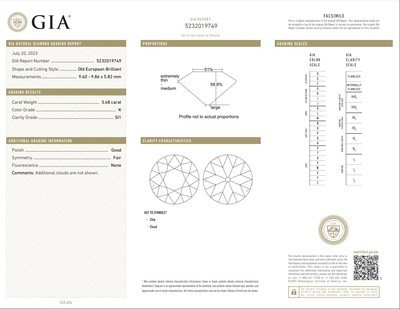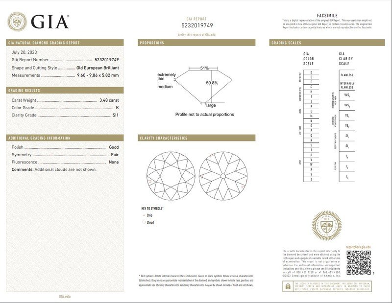 GIA, 2023, Report No. 5232019749, 3.48 carats, K color, SI1 clarity, No fluorescence