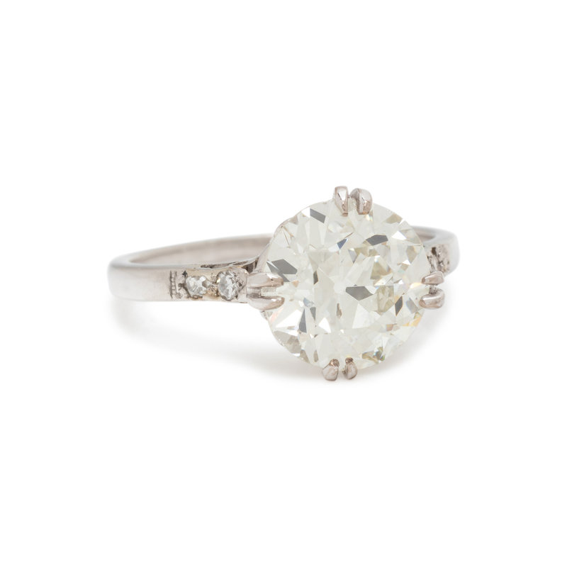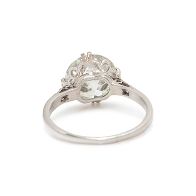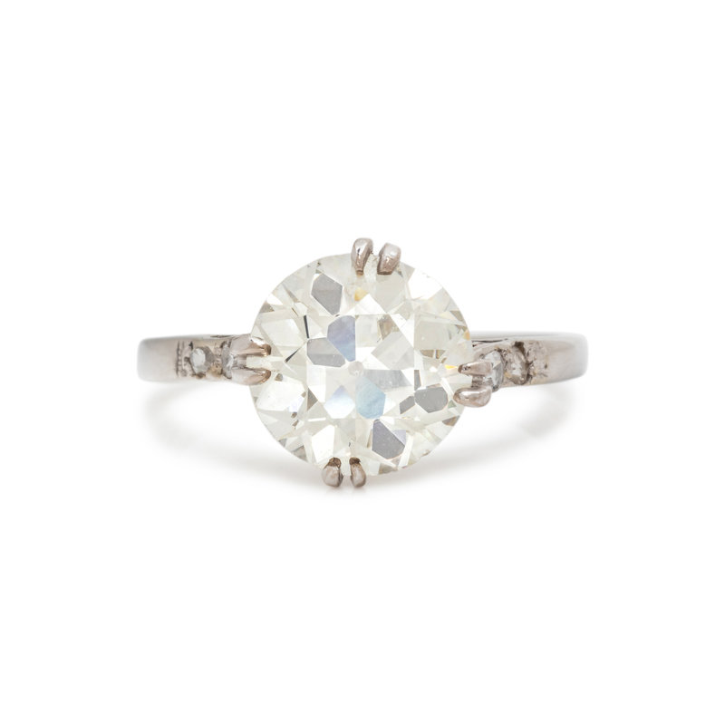 Containing one old European cut diamond weighing 3.48 carats and four single cut diamonds. Mounted in platinum. Ring size 7 1/4.