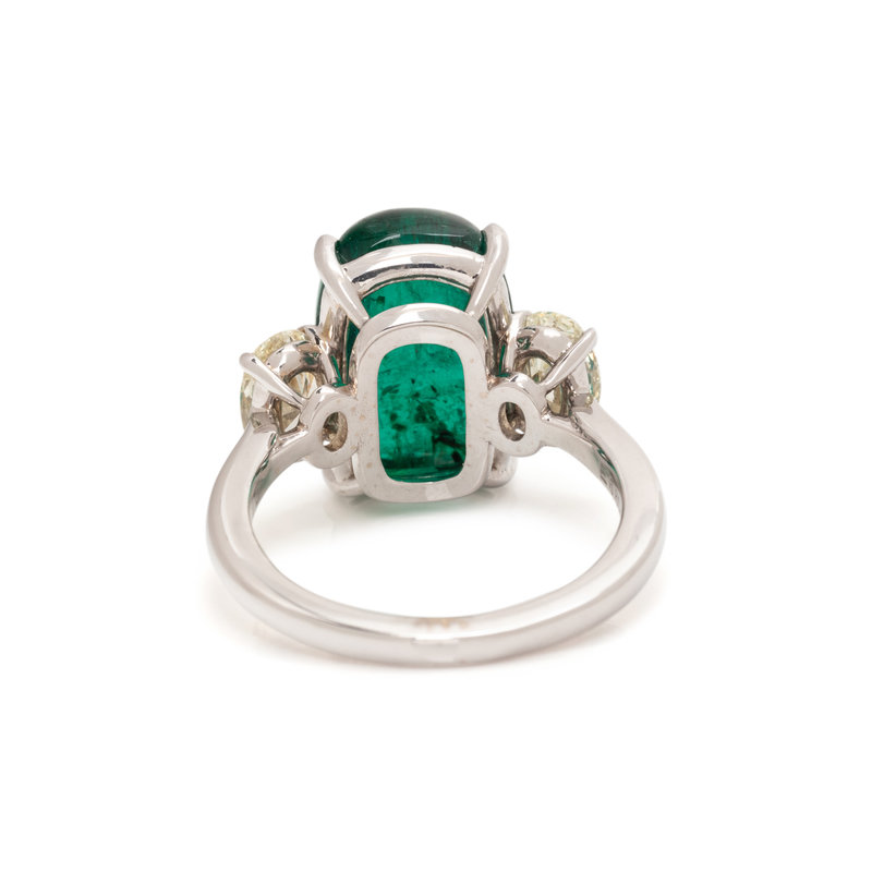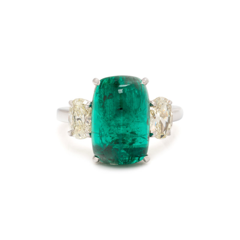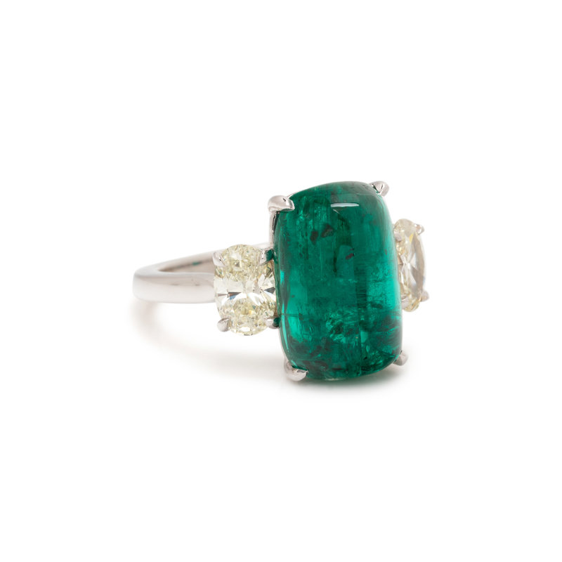 Containing one sugarloaf emerald measuring approximately 14.60 x 9.60 x 5.35 mm and two oval brilliant cut diamonds weighing approximately 1.12 carats total. Mounted in white gold. Ring size 6 3/4.