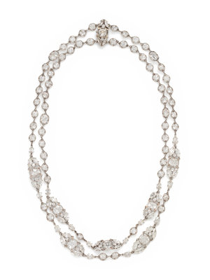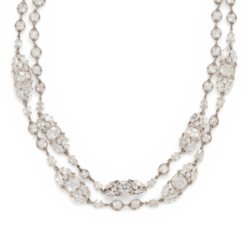 Containing 13 cushion cut diamonds weighing approximately 9.00-10.00 carats total, together with numerous old European, marquise and pear shape diamonds weighing approximately 42.00-43.00 carats total. Mounted in platinum. 16 inches long.