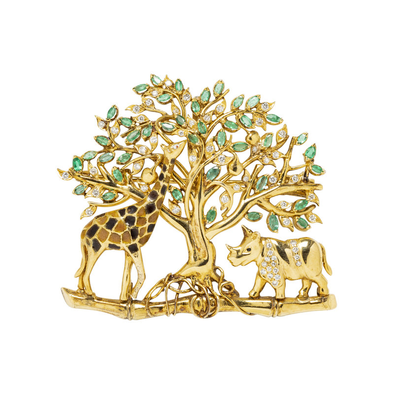 YELLOW GOLD, DIAMOND AND EMERALD SAFARI PENDANT/BROOCH