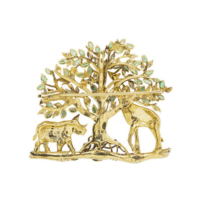 Depicting an enameled giraffe and diamond encrusted rhino under an emerald and diamond tree. 2 x 2 inches.