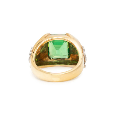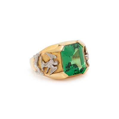 Containing one emerald cut tsavorite garnet measuring approximately 12.30 x 10.40 x 6.50 mm, in a yellow gold mounting with white gold 'VIRTUTE TUTUS' eagle crest. Ring size 8.