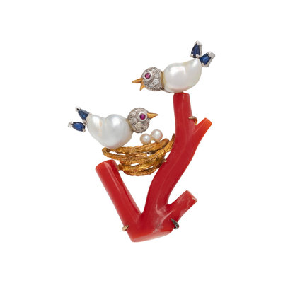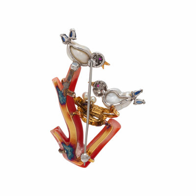 Consisting of a coral branch holding a nest and two birds containing cultured baroque pearl bodies with diamond, ruby and sapphire details. Mounted in bicolor gold. 1 3/4 x 1 1/2 inches.