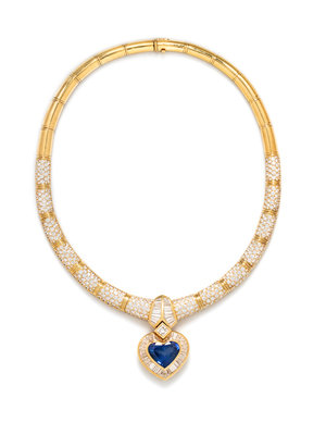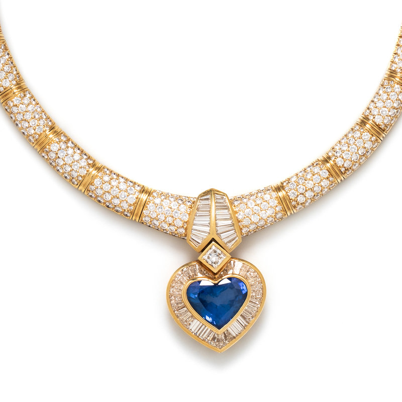 Containing one heart shaped sapphire measuring approximately 14.60 x 17.50 x 8.60 mm, one princess cut diamond weighing approximately 0.80 carat, 52 straight and tapered baguette cut, two triangular shaped and numerous round brilliant cut diamonds weighing approximately 20.25 carats total. Mounted in yellow gold. 17 1/2 inches long.