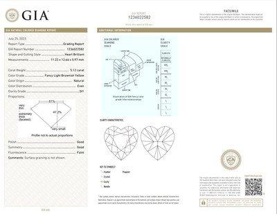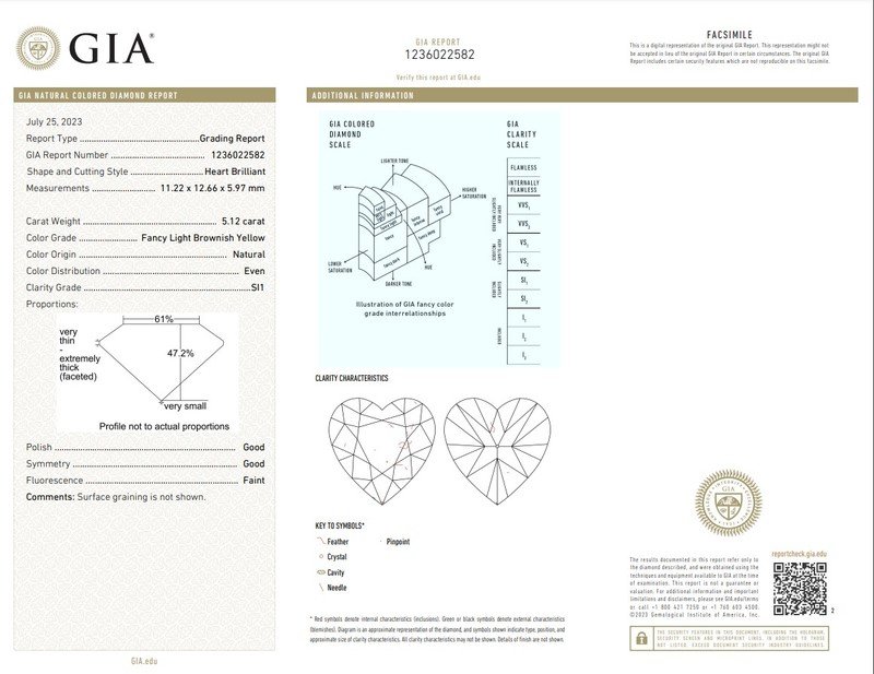 GIA, 2023, Report No. 1236022582, 5.12 carats, Natural Fancy Light Brownish Yellow color, SI1 clarity, Faint fluorescence