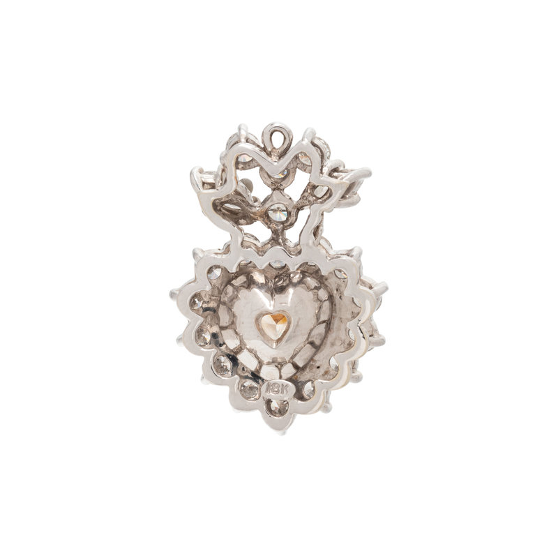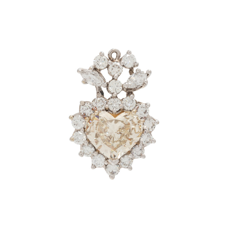 Containing one heart shaped natural fancy light brownish yellow diamond weighing 5.12 carats, 18 round brilliant and two marquise cut diamonds weighing approximately 2.20 carats total. Mounted in bicolor gold. 1 1/8 inches long.