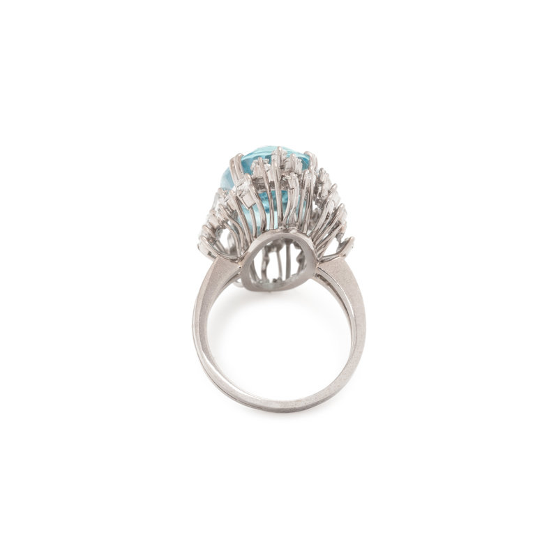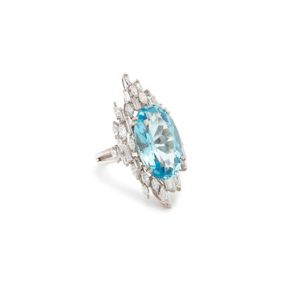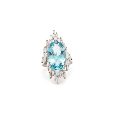 Containing one oval mixed cut aquamarine measuring approximately 18.10 x 11.30 x 7.80 mm, 25 marquise and 17 baguette cut diamonds weighing approximately 2.50 carats total. Mounted in white gold. Ring size 5 3/4.