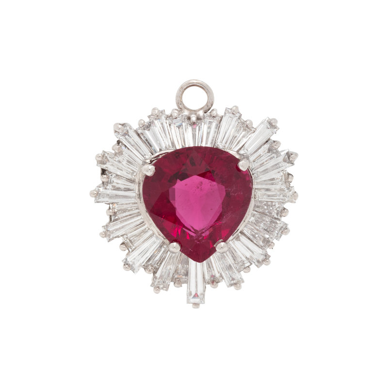 Containing 32 tapered baguette cut diamonds weighing approximately 2.75 carats total and one pear shaped rubellite measuring approximately 12.00 x 11.25 x 6.65 mm. Mounted in white gold. 3/4 inch long.