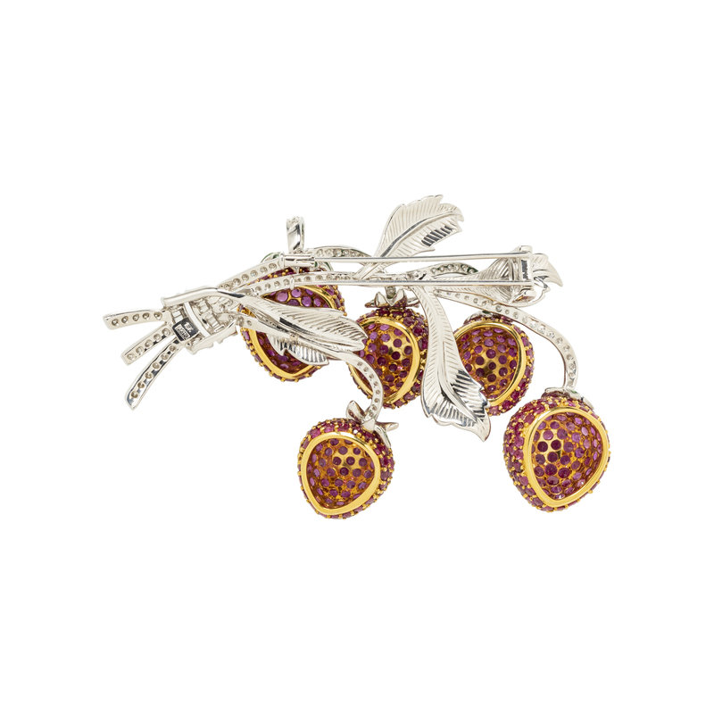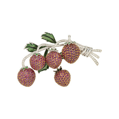 RUBY, DIAMOND AND ENAMEL BERRY BROOCH