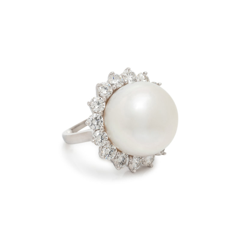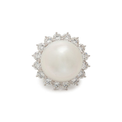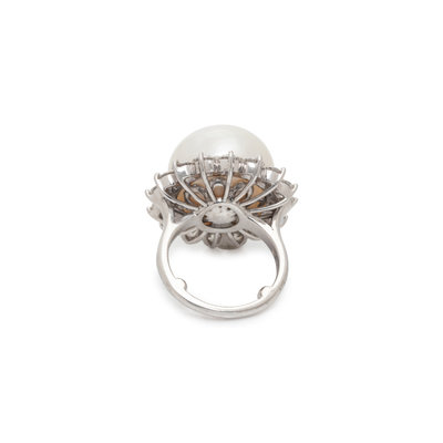 Containing one cultured South Sea pearl measuring approximately 16.80 mm in diameter and 16 round brilliant cut diamonds weighing approximately 2.40 carats total. Mounted in platinum. Ring size 6.