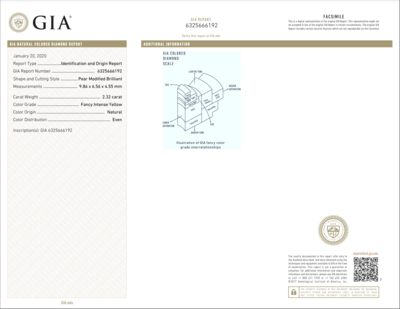 GIA, 2020, Report No. 6325666192, 2.32 carats, Natural Fancy Intense Yellow color