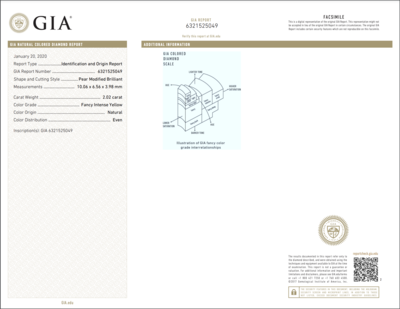 GIA, 2020, Report No. 6321525049, 2.02 carats, Natural Fancy Intense Yellow color