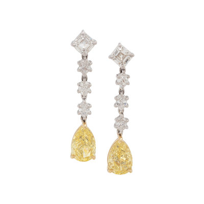 Containing one pear modified brilliant cut fancy intense yellow diamond weighing 2.32 carats, one pear modified brilliant cut fancy intense yellow diamond weighing 2.02 carats, six hexagonal brilliant and two square step cut diamonds weighing approximately 2.20 carats total. Mounted in bicolor gold. 1 3/8 inches long.