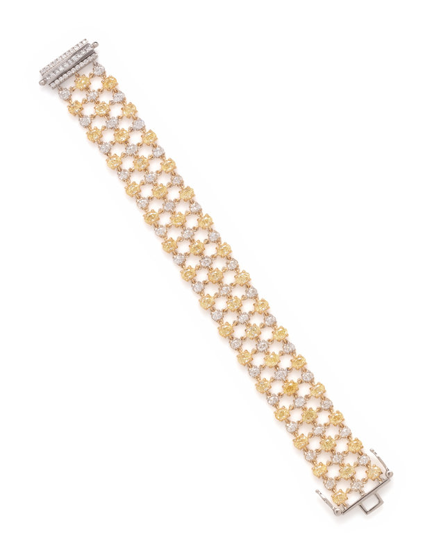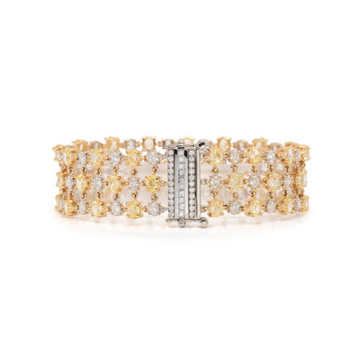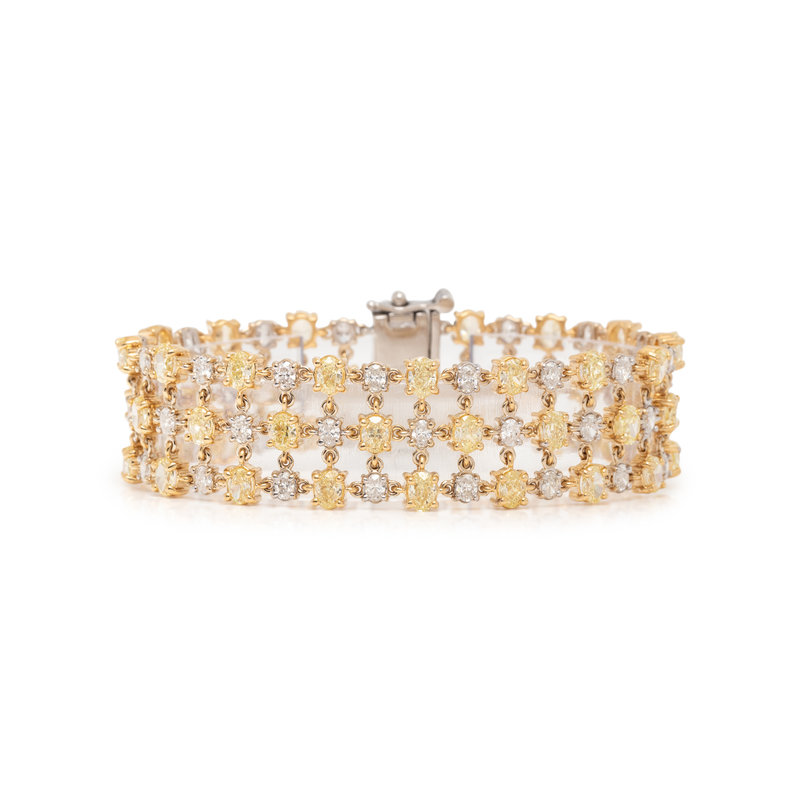 Containing 45 oval cut yellow diamonds (origin of color not tested) weighing approximately 12.10 carats total and 45 oval cut diamonds weighing approximately 4.20 carats total, with diamond clasp. Mounted in platinum and yellow gold. 7 inches long.