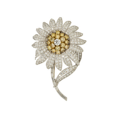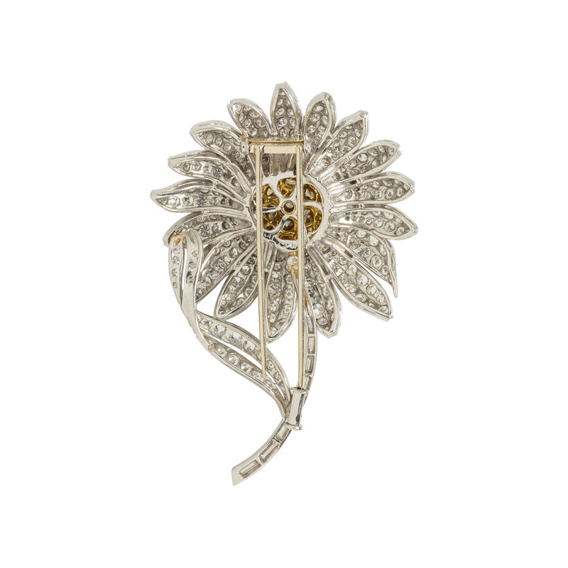 Consisting of a cluster of 18 round brilliant cut yellow diamonds (origin of color not tested) weighing approximately 2.45 carats total, a central round brilliant cut diamond and petals and stem containing numerous round brilliant and baguette cut diamonds weighing approximately 7.50-8.00 carats total. Mounted in platinum and bicolor gold. 2 5/8 x 1 3/4 inches.