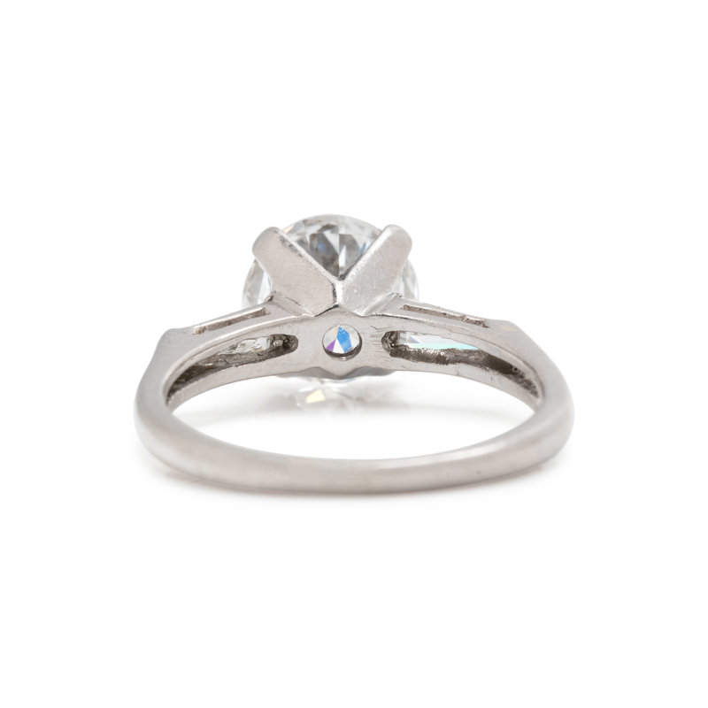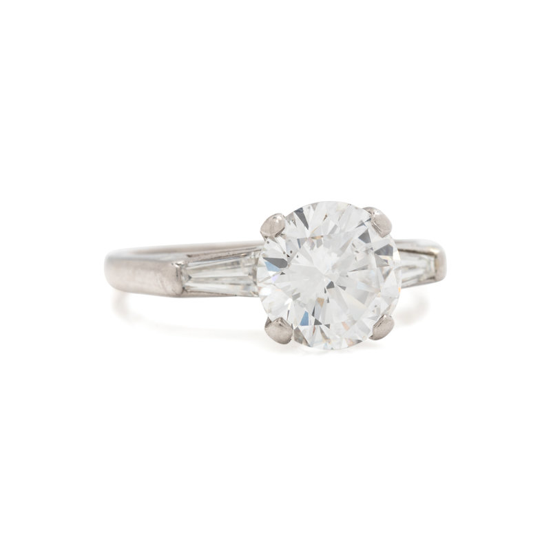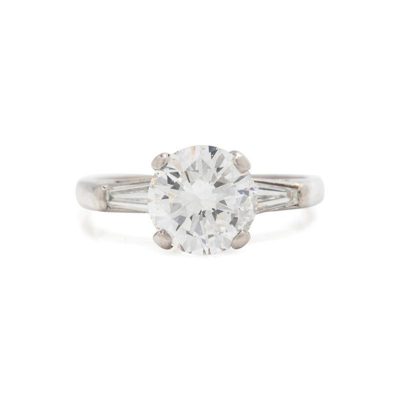 Containing one round brilliant cut diamond weighing 1.83 carats and two tapered baguette cut diamonds. Mounted in platinum. Ring size 6.