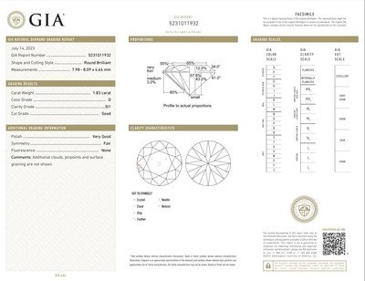 GIA, 2023, Report No. 5231011932, 1.83 carats, D color, SI1 clarity, No fluorescence