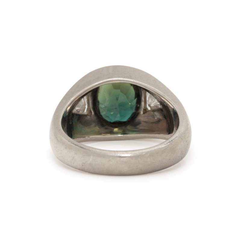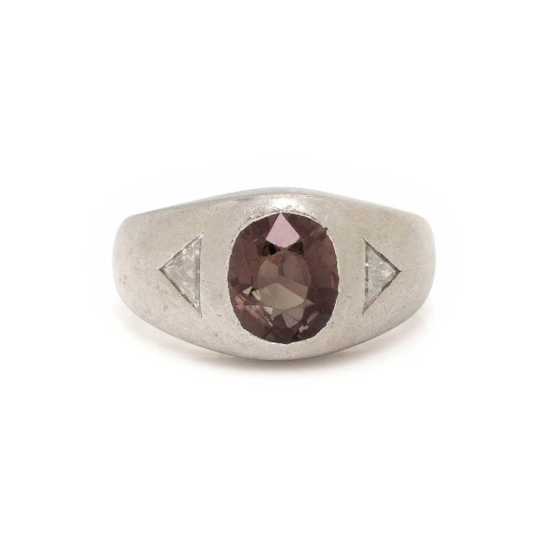 Containing one oval mixed cut alexandrite measuring approximately 8.65 x 7.25 x 5.30 mm and two triangular cut diamonds weighing approximately 0.40 carat total. Mounted in platinum. Ring size 6.