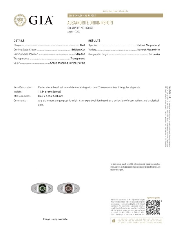 GIA, 2023, Report No. 2231028520, Natural Chrysoberyl, Alexandrite, Sri Lanka (Ceylon), Green to Pink-Purple, No enhancement