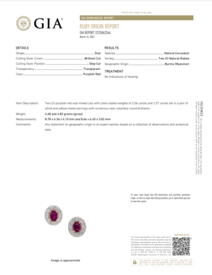 GIA, 2023, Report No. 2225843344, Natural Corundum, Ruby, Burma (Myanmar), No indications of heating