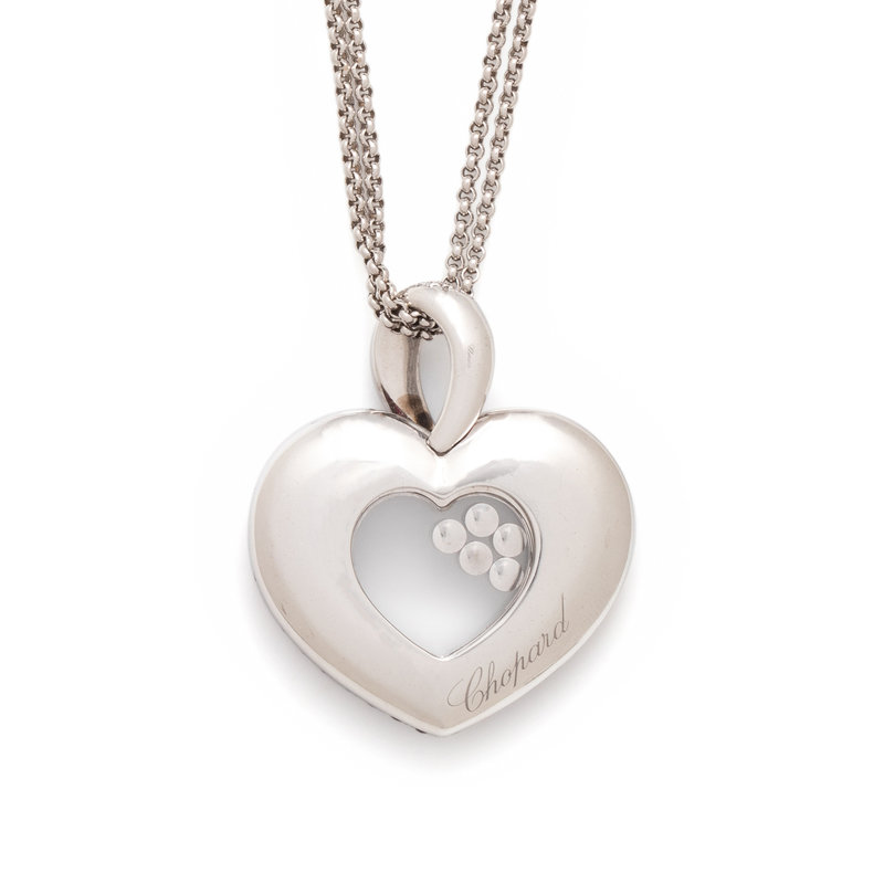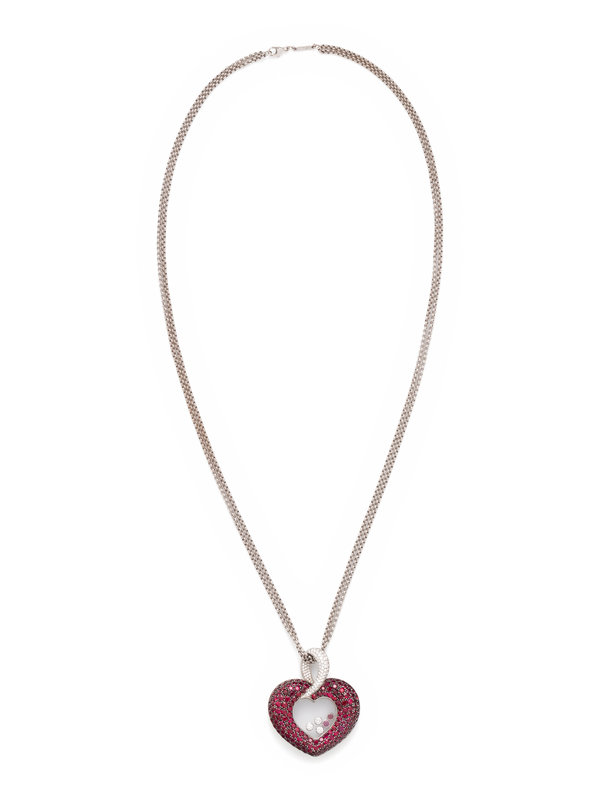 Consisting of a double cable link chain, suspending a heart shaped pendant containing numerous round brilliant cut diamonds weighing approximately 0.80 carat total and numerous round mixed cut rubies, with a central glazed compartment containing two floating rubies and three diamonds. Mounted in white gold. Chain: 23 1/2 inches long. Pendant: 1 3/4 inches long.