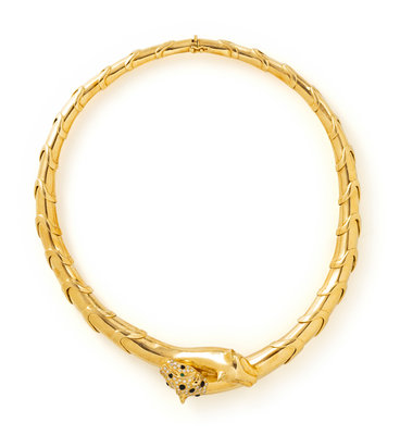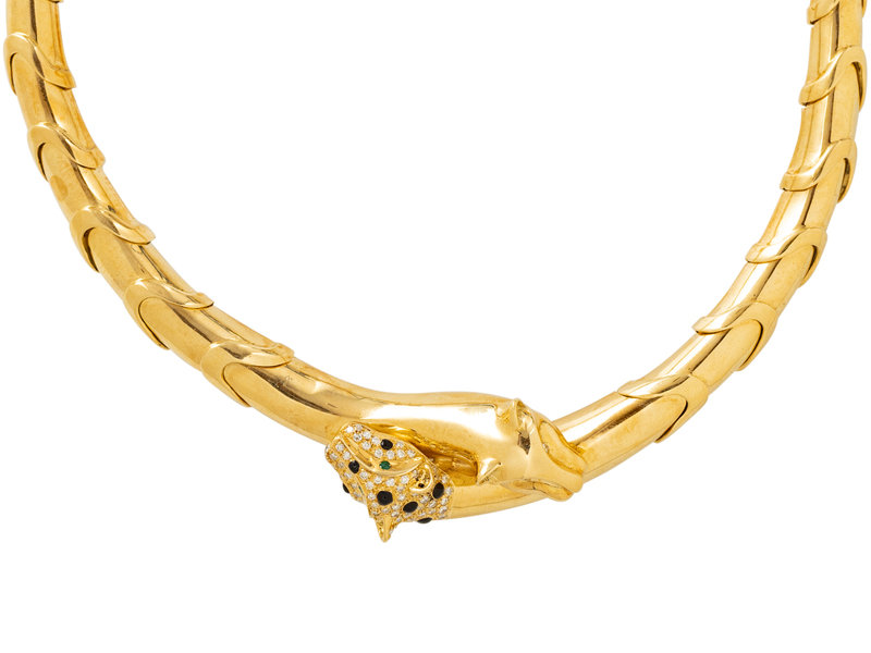 In a bypass design, consisting of articulated gold links with leopard head terminals containing round brilliant cut diamonds weighing approximately 1.50 carats total, emerald eyes and black enamel spots. 16 inches long.