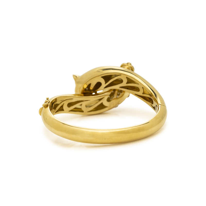In a bypass design with leopard heads containing round brilliant cut diamonds weighing approximately 0.55 carat total, emerald eyes and black enamel spots, hinged with side clasp. 6 1/4 inches inner circumference.