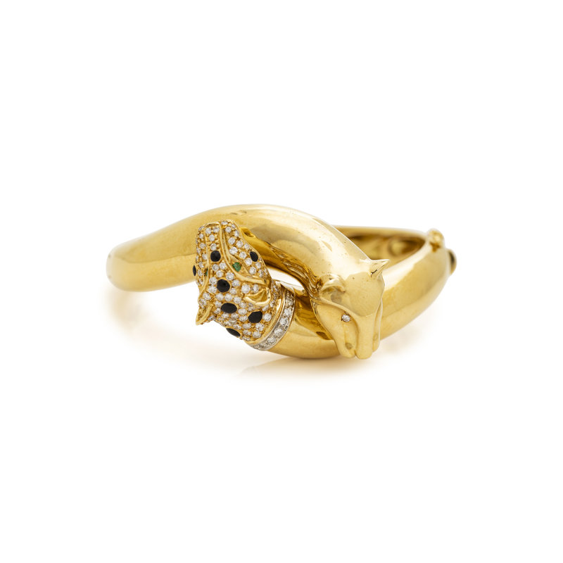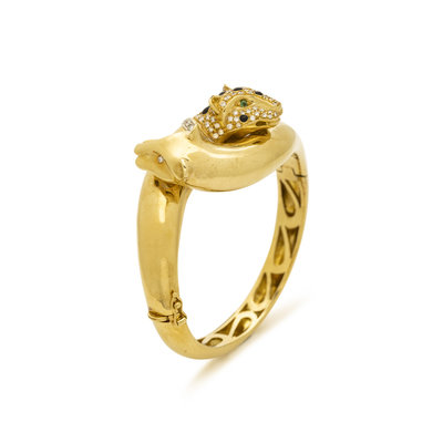 YELLOW GOLD, DIAMOND, EMERALD AND ENAMEL LEOPARD BANGLE BRACELET