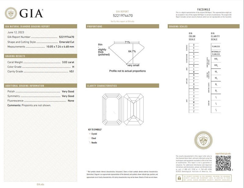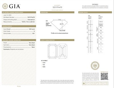 GIA, 2023, Report No. 5221974470, 3.02 carats, H color, VS1 clarity, No fluorescence