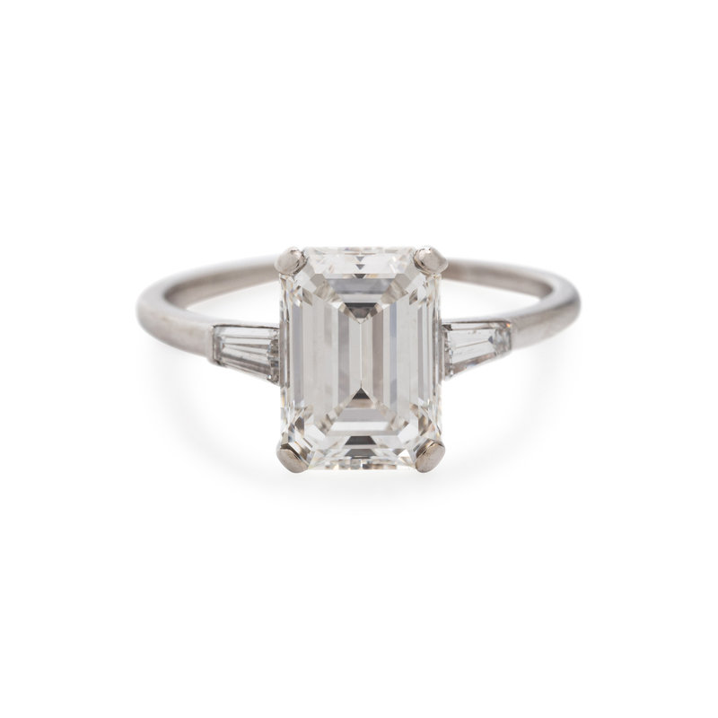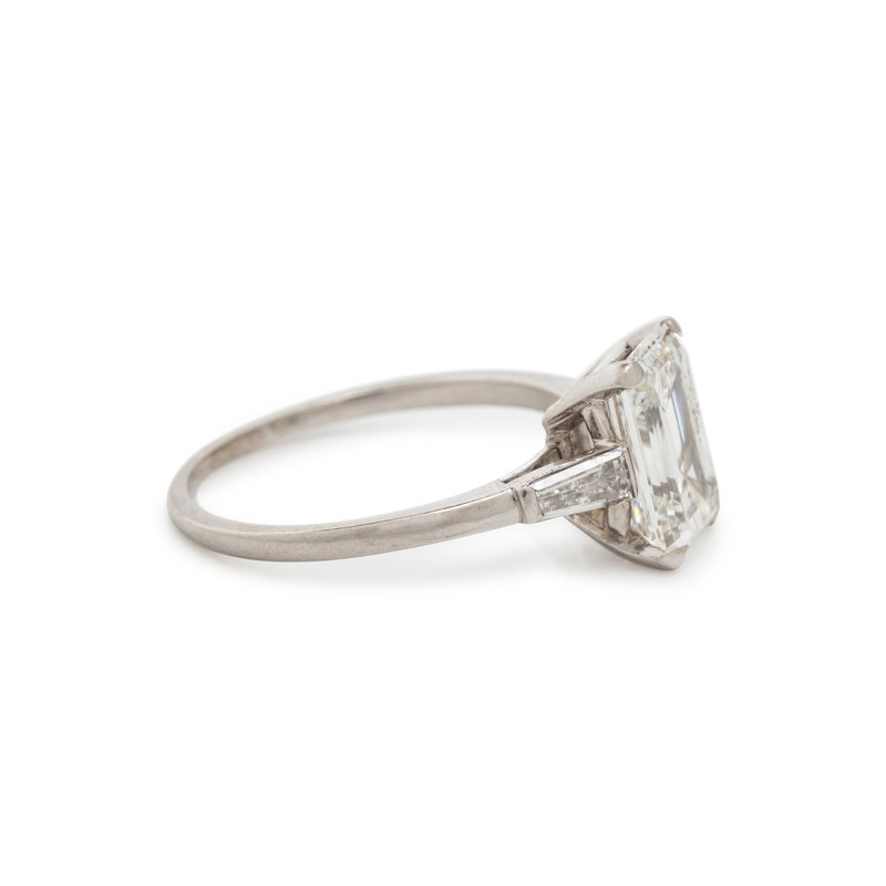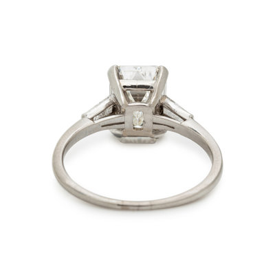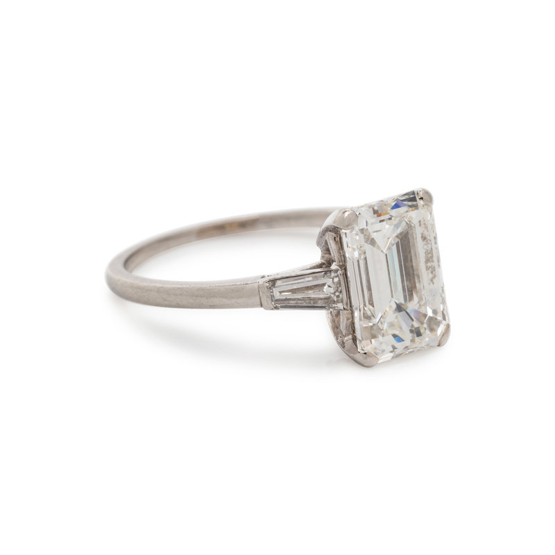 Containing one emerald cut diamond weighing 3.02 carats and two tapered baguette cut diamonds weighing approximately 0.30 carat total. Mounted in platinum. Ring size 8.