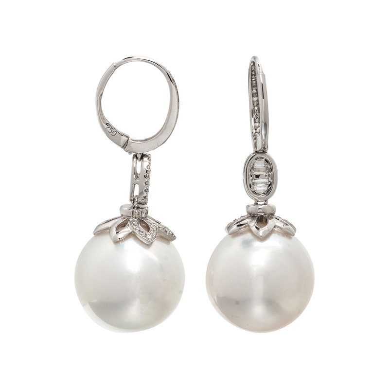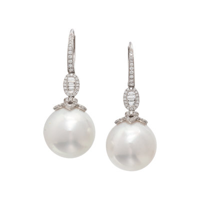 Containing eight baguette and numerous round brilliant cut diamonds weighing approximately 1.50 carats total and two cultured South Sea pearls measuring approximately 16.00 mm in diameter. Mounted in white gold. 1 1/2 inches long.