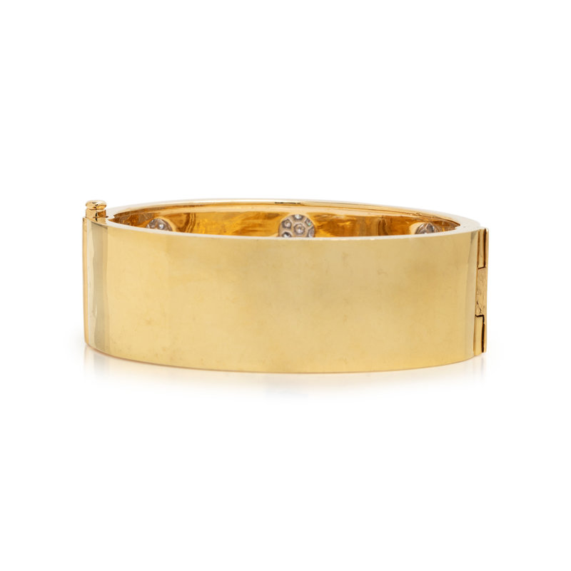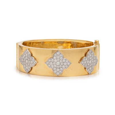 Consisting of three quatrefoils containing numerous round brilliant cut diamonds weighing approximately 3.00 carats total set on a hinged high polish bangle with side clasp. 7 inches inner circumference.
