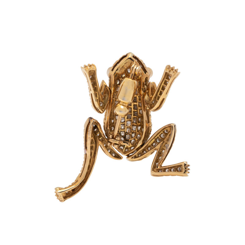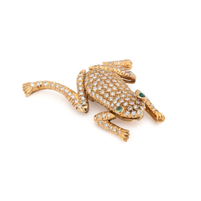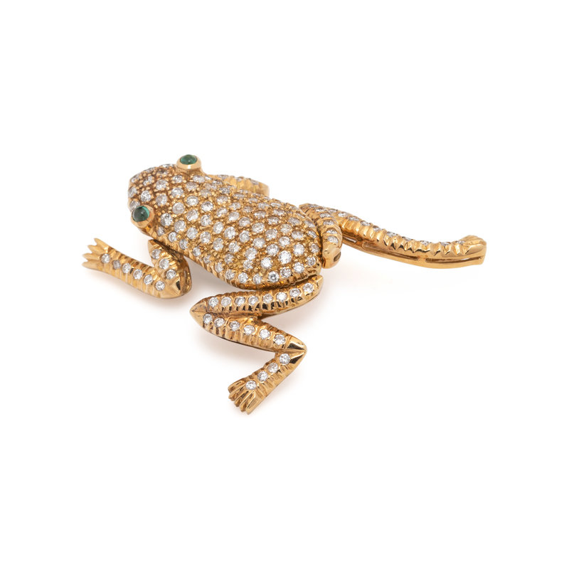 Containing 137 round brilliant cut diamonds weighing approximately 2.10 carats total and two round cabochon emerald eyes, with articulated arms and legs. Mounted in yellow gold. 1 1/2 x 1 1/4 inches.