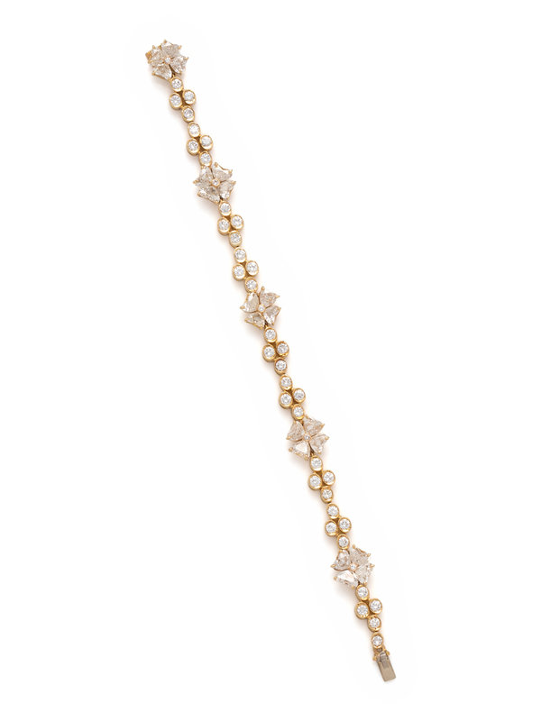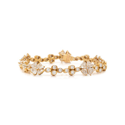 Containing 20 heart shaped and 42 round brilliant cut diamonds weighing approximately 12.00 carats total. Mounted in yellow gold. 7 inches long.