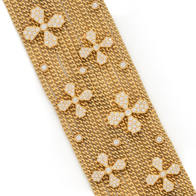 Consisting of 14 yellow gold curb link chains surmounted with 11 bezel set round brilliant cut diamonds and eight floral motifs containing 264 round brilliant cut diamonds, with clasp containing 19 round brilliant cut diamonds weighing approximately 4.15 carats total. 6 1/2 inches long.