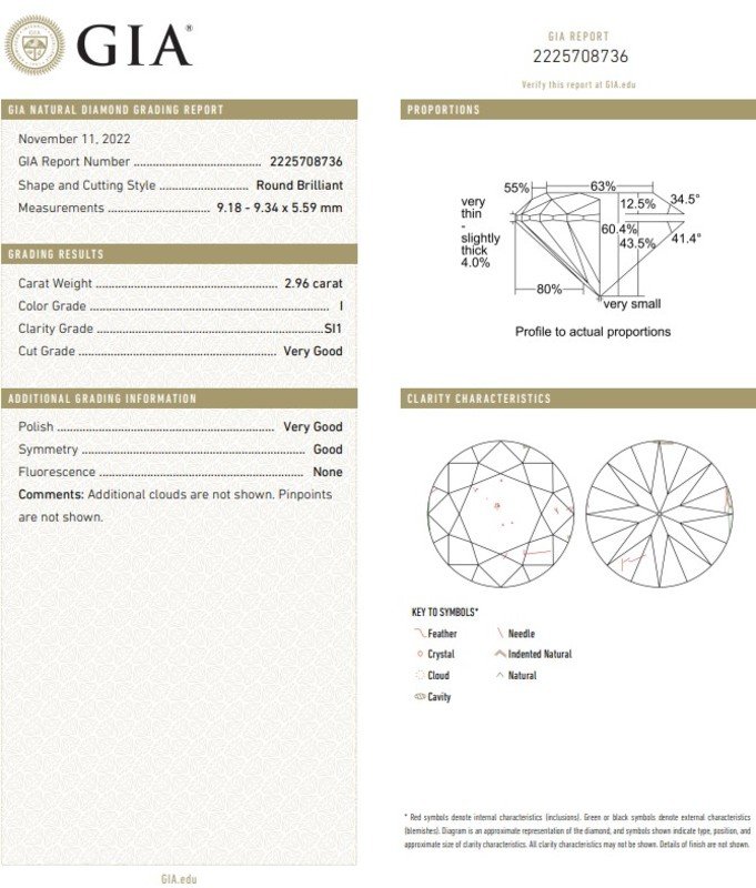 GIA, 2022, Report No. 2225708736, 2.96 carats, I color, SI1 clarity, No fluorescence